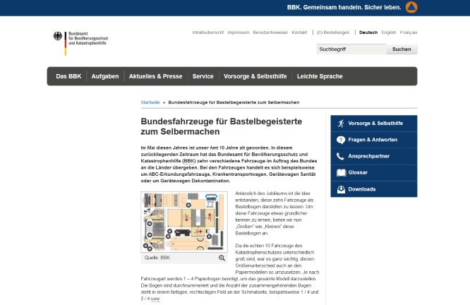 Unser Fundstück des Monats ist diesmal etwas für kreative Köpfe: Das Bundesamt für Bevölkerungsschutz und Katastrophenhilfe hat Bastelbögen von Einsatzfahrzeugen des Katastrophenschutzes veröffentlicht.