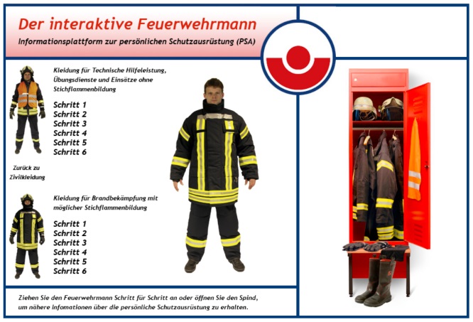 Was gehört zur persönlichen Schutzausrüstung eines Feuerwehrangehörigen? Die Feuerwehr-Unfallkasse für Hamburg, Mecklenburg-Vorpommern und Schleswig-Holstein erklärt dies mit einem interaktiven Feuerwehrmann.