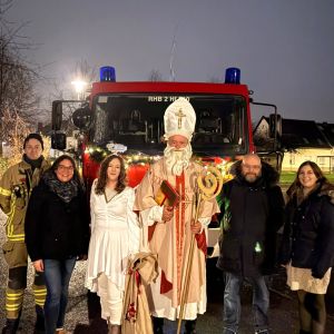 Die fröhliche Wanderung wurde von einem vorbeifahrenden Feuerwehrauto unterbrochen, das sofort die Aufmerksamkeit der Kinder auf sich zog. Zu ihrer großen Überraschung saßen der Nikolaus und sein Engelchen in dem Fahrzeug. Die Einsatzabteilung der Löschgruppe Wormersdorf unterstütze so bereits zum zweiten Mal den Nikolaus bei seinem Besuch des Kindergartens.