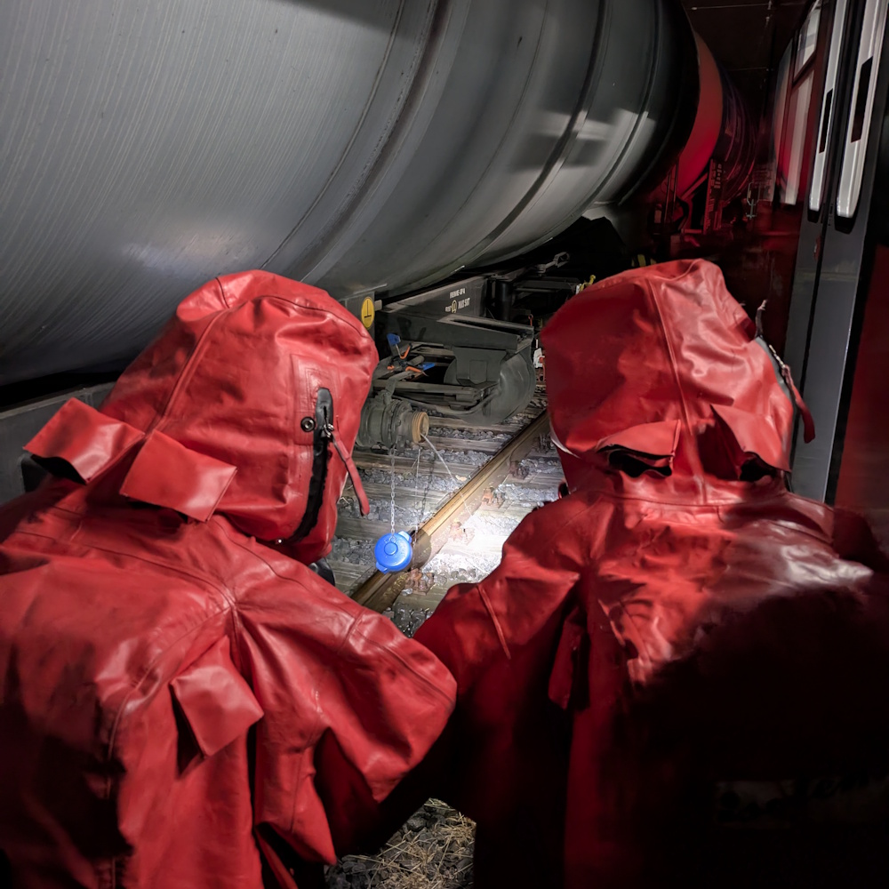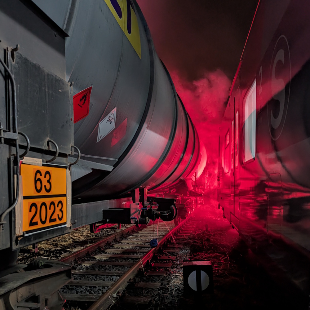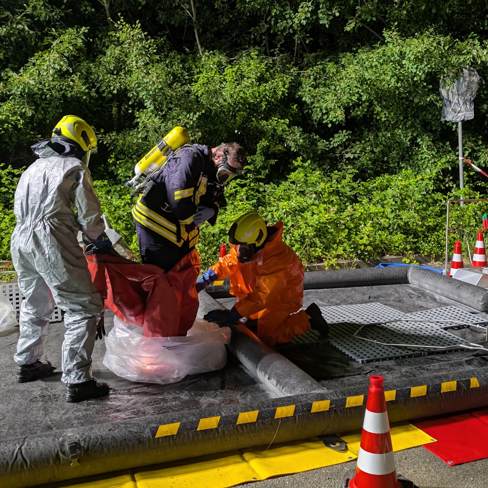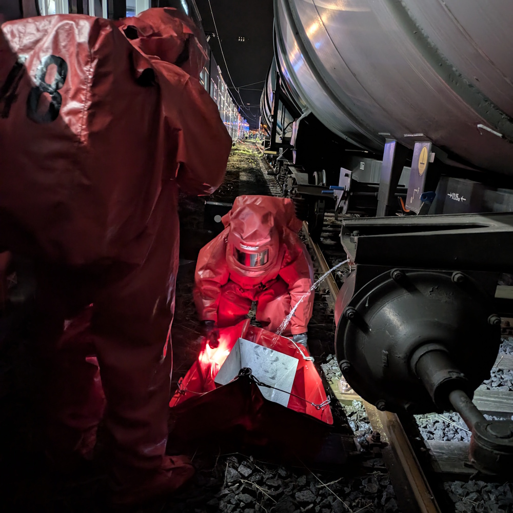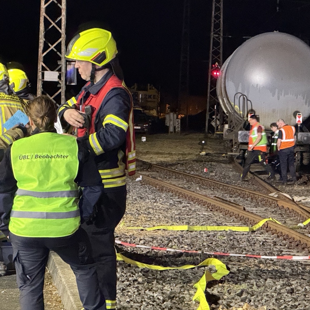 Es galt also zum einen, die Personen aus dem verunfallten Güterzug zu retten, zum anderen den Gefahrstoff zu erkennen und aufzufangen bzw. im weiteren Verlauf das Leck abzudichten.