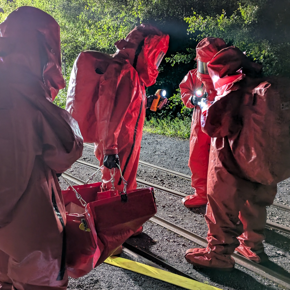 Unsere Einsatzkräfte waren dabei im Einsatzabschnitt „Gefahrstoffaustritt“ eingesetzt und gingen mit Chemieschutzanzügen (CSA) in das Gleisbett an den verunfallten Kesselwagen vor.