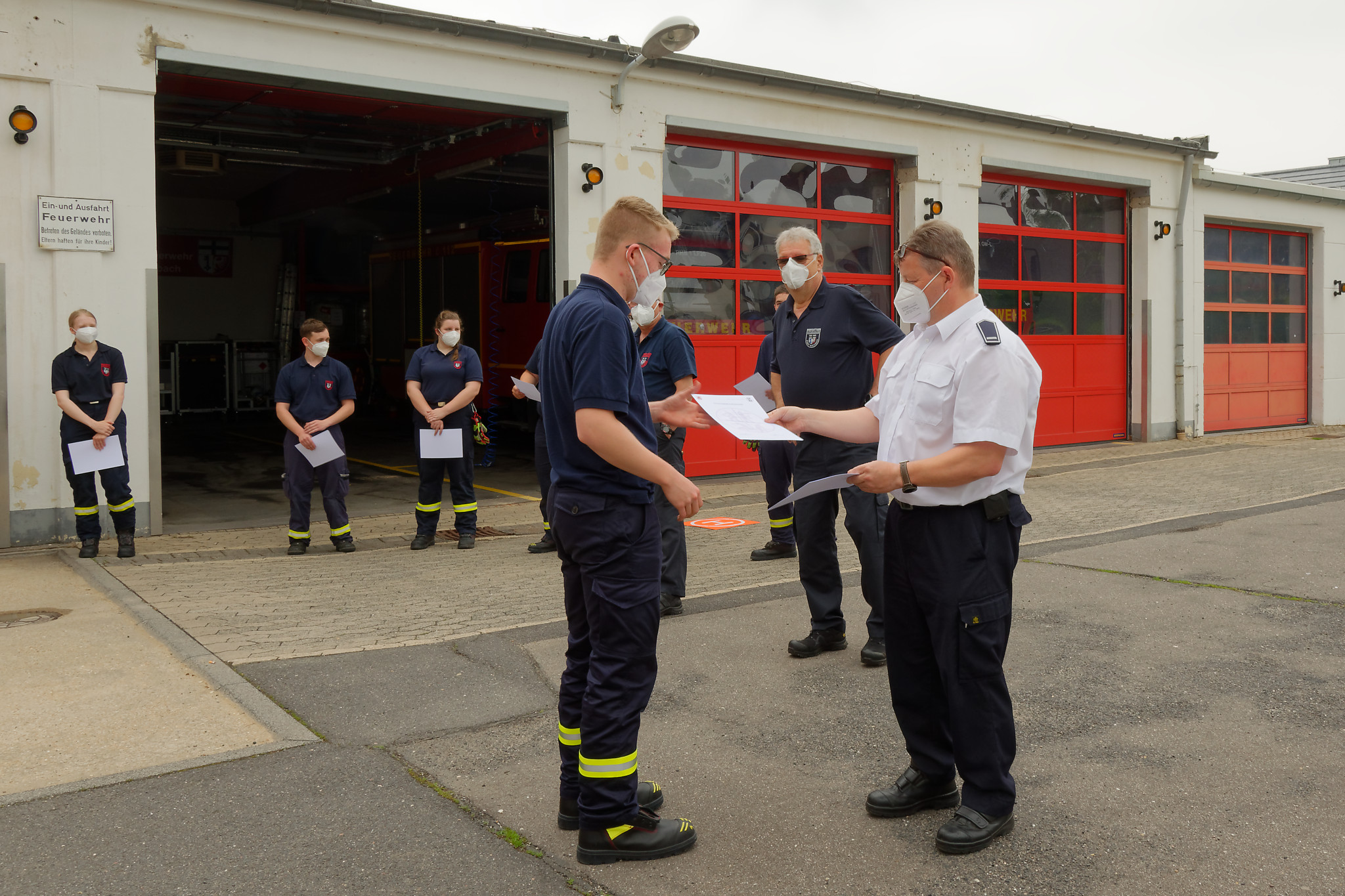 Zehn Teilnehmerinnen und Teilnehmer konnten dann am 5. Juni ihre Urkunden aus den Händen von Lehrgangsleiter Thomas Gundlach und Wehrleiter Laurenz Kreuser entgegennehmen.