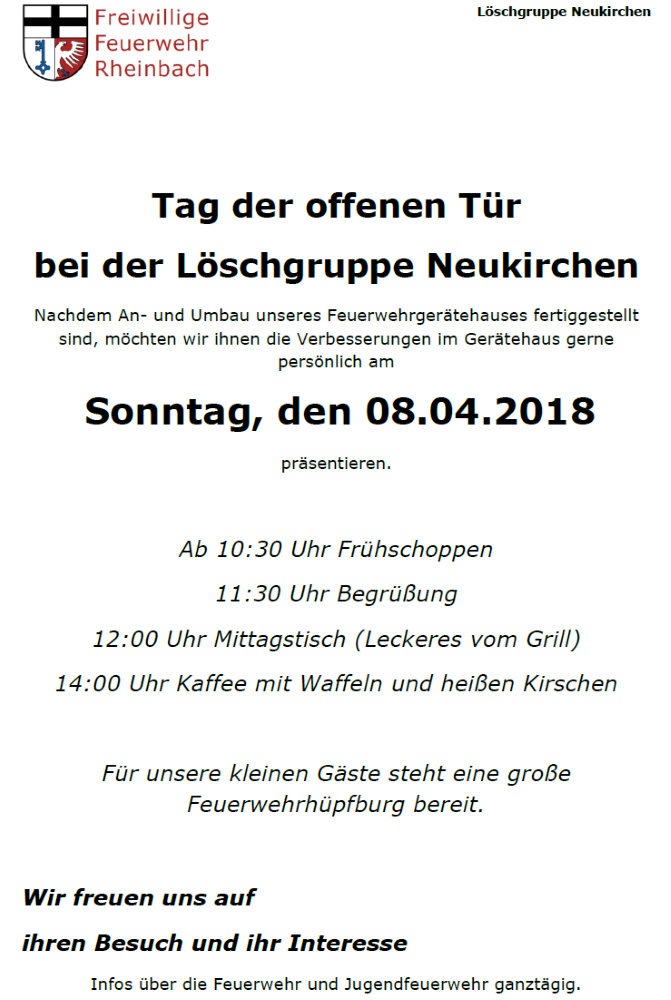 Am Sonntag, dem 08. April 2018 öffnet die Löschgruppe Neukirchen ab 10:30 Uhr die Türen und Tore ihres Gerätehauses in der Neukirchener Straße. Alle Bürgerinnen und Bürger sind eingeladen, das Feuerwehrgerätehaus mit seiner neuen Umkleide und dem erweiterten Schulungsraum zu besichtigen und sich über die ehrenamtliche Arbeit der Neukirchener Feuerwehrkameradinnen und -kameraden zu informieren.