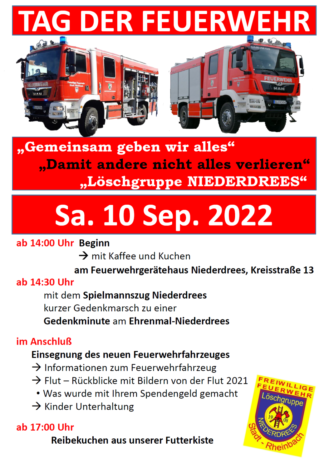 Am Samstag, dem 10. September 2022 findet in Niederdrees die Fahrzeugeinweihung des neuen Feuerwehrfahrzeugs und das diesjährige Feuerwehrfest statt.
