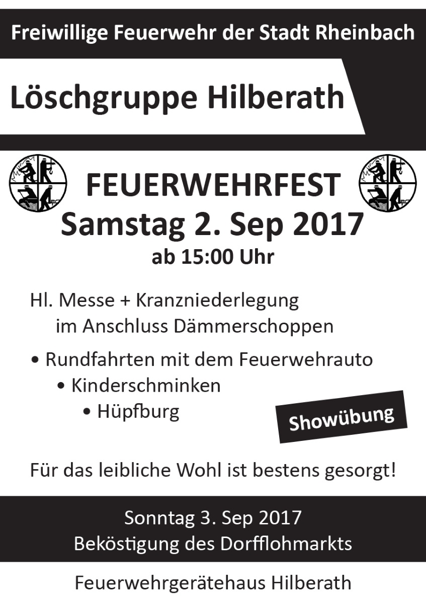 Am Samstag, dem 2. September 2017 findet das diesjährige Feuerwehrfest in Hilberath statt. Am Sonntag, dem 3. September beköstigen die Kameradinnen und Kameraden der Löschgruppe Hilberath zudem den dortigen Dorfflohmarkt.