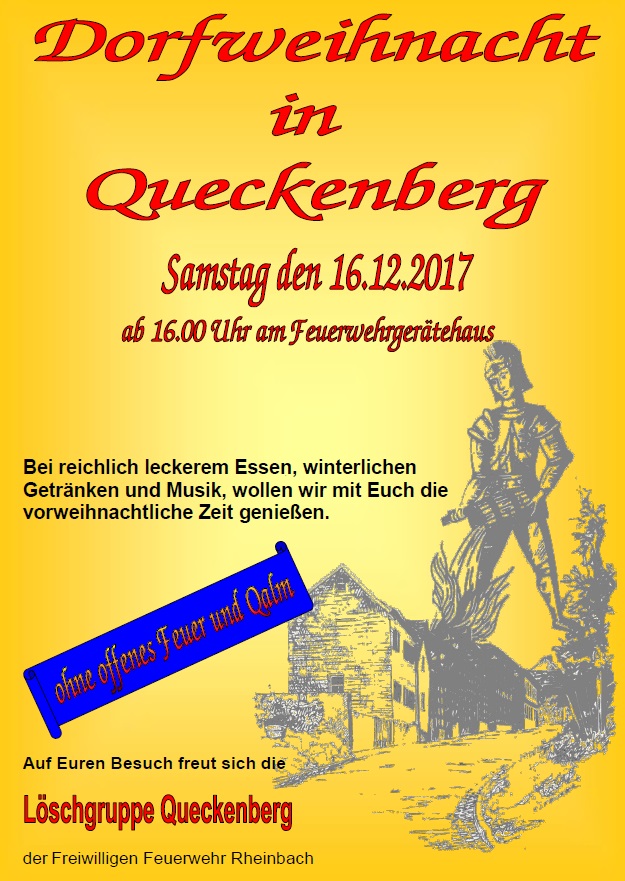 Am Samstag, dem 16. Dezember 2017 lädt die Löschgruppe Queckenberg ein zur traditionellen Dorfweihnacht am Queckenberger Feuerwehrgerätehaus.