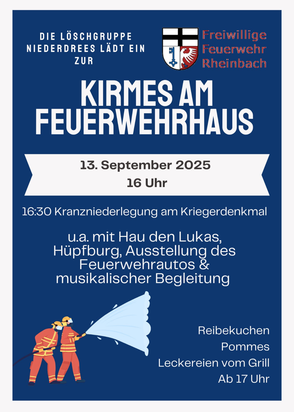 Am Samstag, dem 13. September 2025 findet die diesjährige Kirmes am Feuerwehrhaus in Niederdrees statt.