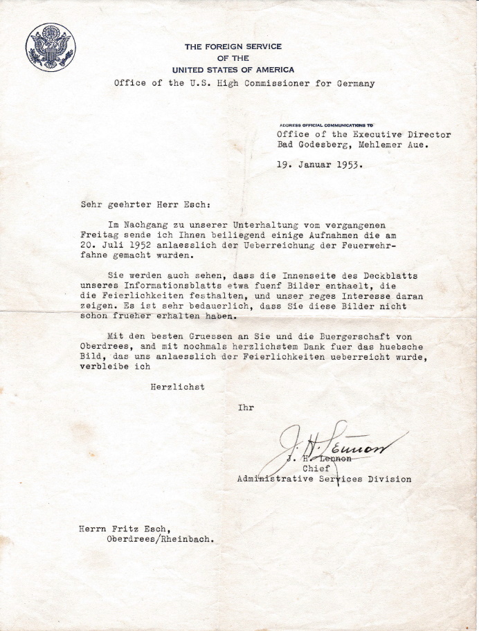 Am 20. Juli 1952 wurde eine neu gestiftete Fahne, welche der Original-Fahne nachempfunden ist, vom "Office of the U.S High Commissioner for Germany" im Namen der amerikanischen Besatzungsmacht feierlich an Herrn Friedrich Esch, seinerzeit Leiter der Oberdreeser Feuerwehr, und seine Kameraden übergeben.