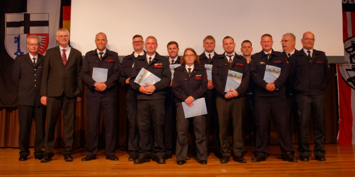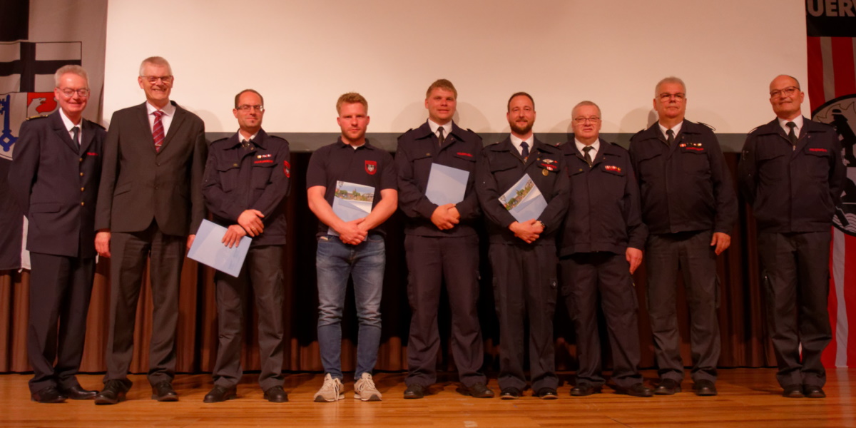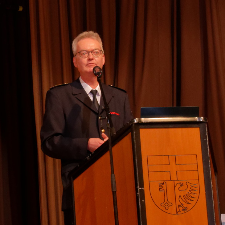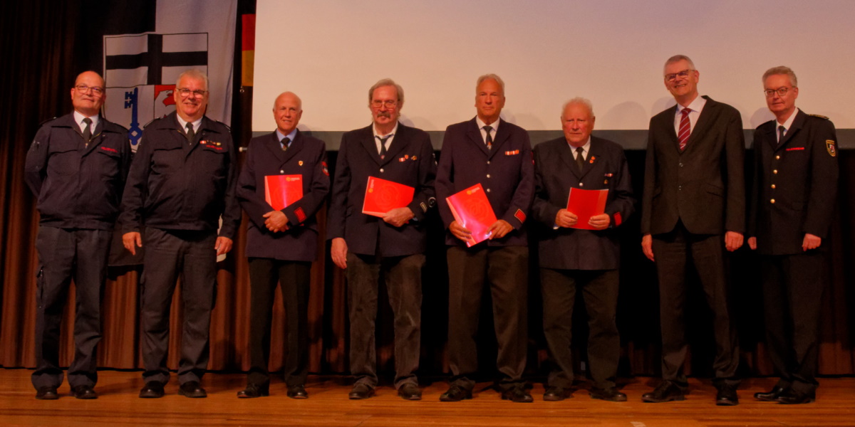 Nach dem Jahresrückblick und den Grußworten von Bürgermeister Ludger Banken und Kreisbrandmeister Dirk Engstenberg geht es weiter zu den Ehrungen und Beförderungen. Wehrleiter Laurenz Kreuser übernimmt wieder das Wort und überreicht vielen Kameradinnen und Kameraden Ehrungen für 25, 35, 50 und 60 Jahre Mitgliedschaft und aktiven Dienst in der Feuerwehr. Hans Kurscheidt aus der Löschgruppe Flerzheim wird sogar für 70 Jahre Mitgliedschaft in der Feuerwehr geehrt.