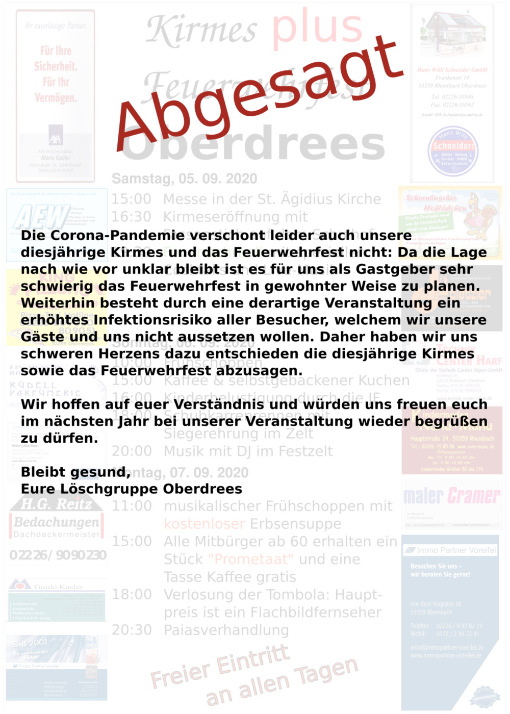 Die Löschgruppe Oberdrees hat die diesjährige Kirmes und das Feuerwehrfest abgesagt. Die Veranstaltung sollte eigentlich vom 05.09. bis zum 07.09.2020 stattfinden.