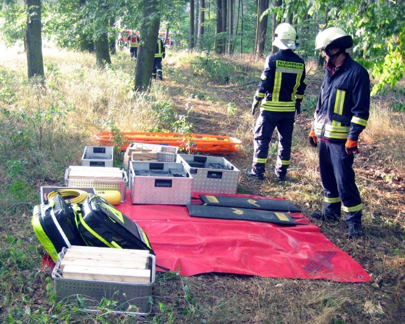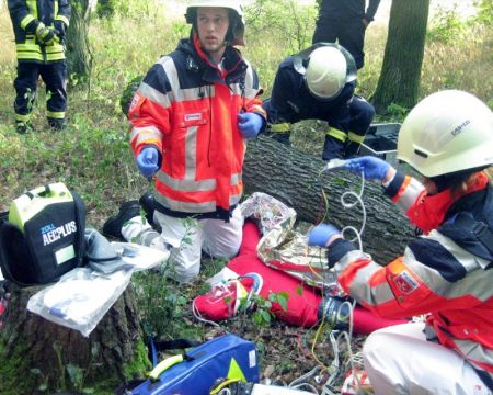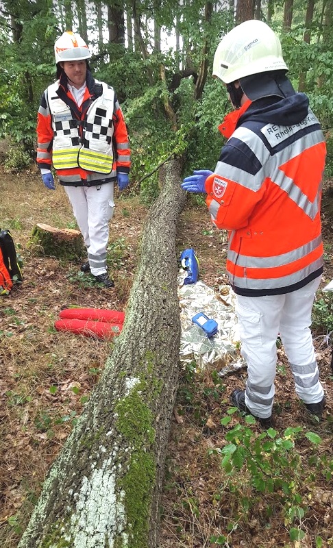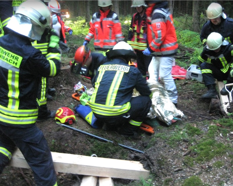 Der Einsatzleiter gab sofort an alle den Einsatzbefehl weiter, und es wurde eine Personensuche eingeleitet. In Zusammenarbeit mit dem Rettungsdienst wurden sog. „First-Responder-Teams“ gebildet, um zeitnah den Waldarbeiter medizinisch zu versorgen. Nach ca. acht Minuten wurde der Verunfallte aufgefunden und eine medizinische Erstversorgung eingeleitet. Nun galt es, das Rettungsdienstpersonal mit dem Notarzt sowie das technische Gerät zur Befreiung des Verunfallten so schnell wie möglich an die Einsatzstelle zu ordern. Hierzu mussten ca. 600 Meter Fußmarsch in teilweise unwegsamem Gelände erfolgen.