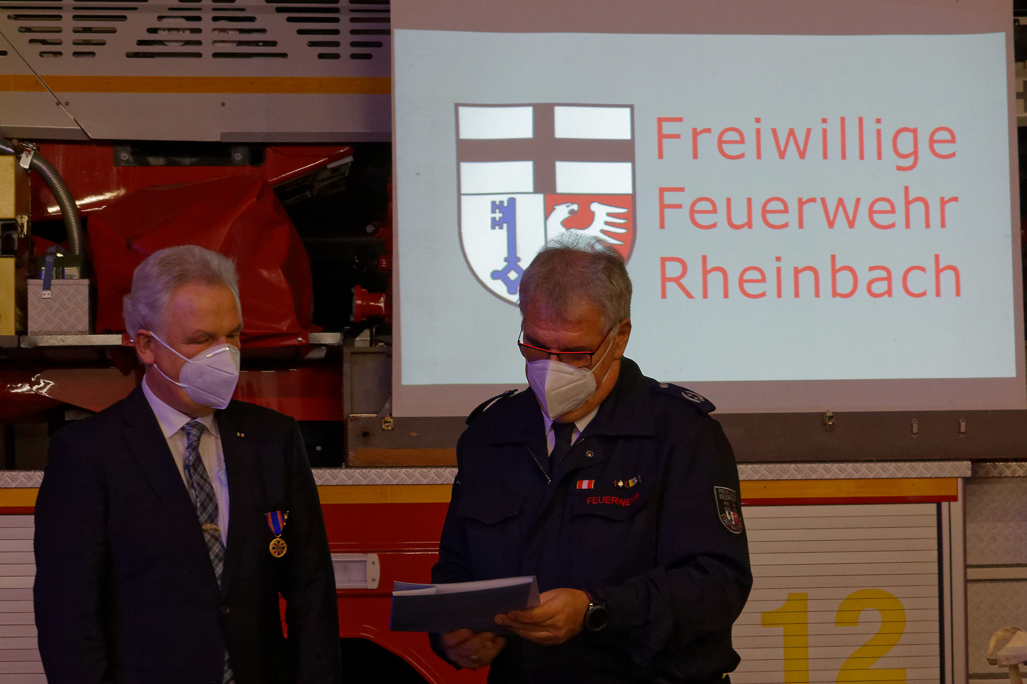 Danach trat Kreisbrandmeister Dirk Engstenberg nach vorne und hatte eine weitere Ehrung im Gepäck: Die Deutsche Feuerwehr-Ehrenmedaille des Deutschen Feuerwehrverbandes (DFV). Diese Ehrung kann Personen zuteilwerden, die sich um die Feuerwehr verdient gemacht haben, aber selbst nicht Feuerwehrangehörige sind. In seiner Ansprache hob Engstenberg hervor, dass sich das Wirken von Bürgermeister Stefan Raetz nicht nur auf „sein“ Rheinbach beschränkte, sondern auch darüber hinaus im ganzen Rhein-Sieg-Kreis bemerkbar machte.