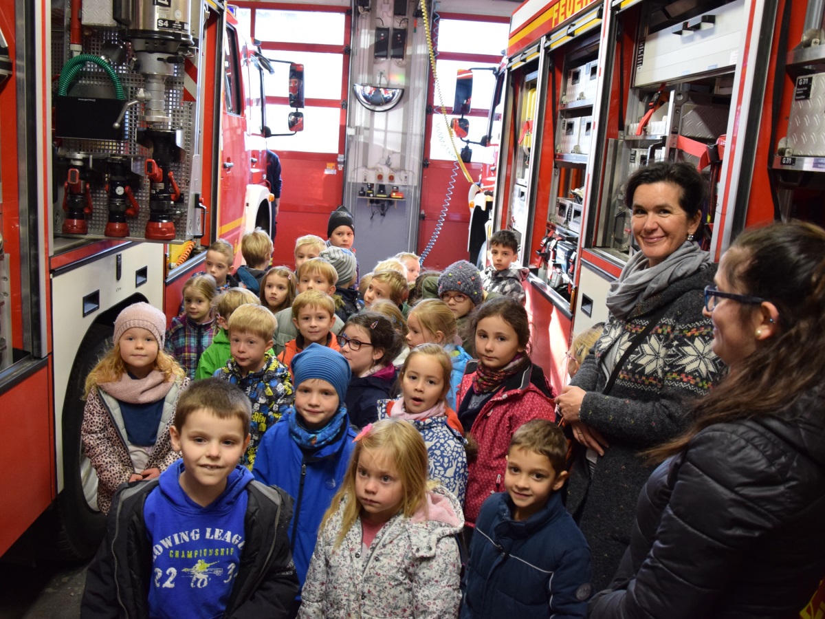 Begeistert ließen sie sich dort die großen Feuerwehrautos und die Ausrüstung der Feuerwehr zeigen und lauschten gespannt den Ausführungen der Einsatzkräfte.