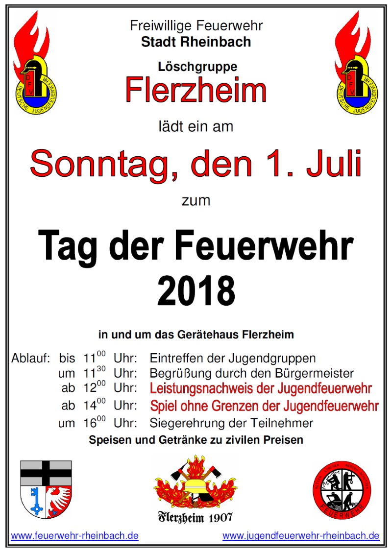Am 1. Juli 2018 findet in Flerzheim der Tag der Feuerwehr statt. An diesem Tag wird sowohl der diesjährige Leistungsnachweis als auch das Spiel ohne Grenzen der Jugendfeuerwehr rund um das Gerätehaus der Löschgruppe Flerzheim ausgetragen.