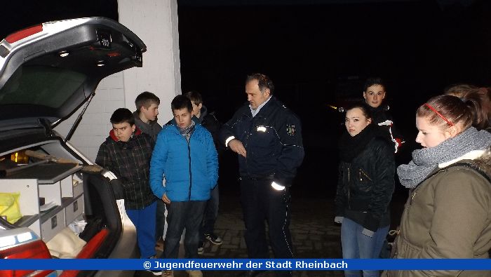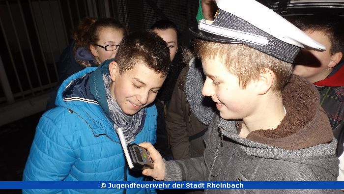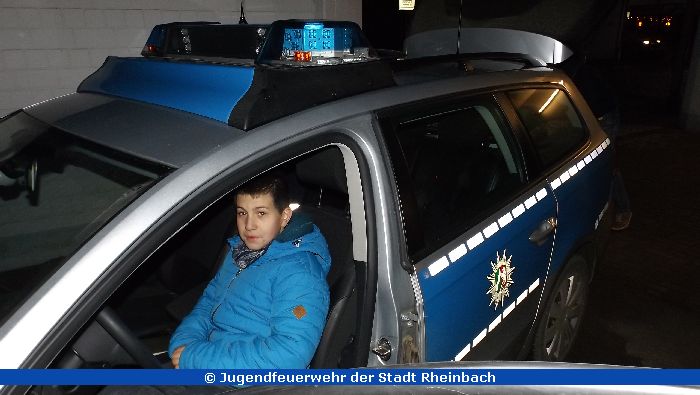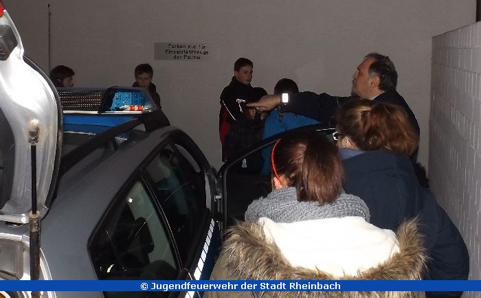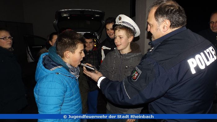 In der vergangenen Woche besuchte die Jugendfeuerwehr Rheinbach Kern die Polizeiwache in der Grabenstraße in Rheinbach. Polizeibeamter Peter Schuhmacher begrüßte die anfangs etwas schüchterne Truppe und zeigte ihnen zunächst einen Streifenwagen. Da fanden sich allerhand Dinge, die die Gruppe dann zum Fragen anregte. So sahen die Floriansjünger neben Pfefferspray, was gar nicht so selten verwendet wird, alle möglichen Materialien zur Spuren- und Unfallsicherung. Und selbst Gummistiefel fanden sich im Kofferraum. Herr Schuhmacher erklärte, dass diese in matschigen Einsätzen getragen würden. Helle Aufregung brachte dann die Vorführung eines Teleskopschlagstocks. Und sogar das Alkoholtestgerät durften die Jugendlichen ausprobieren.