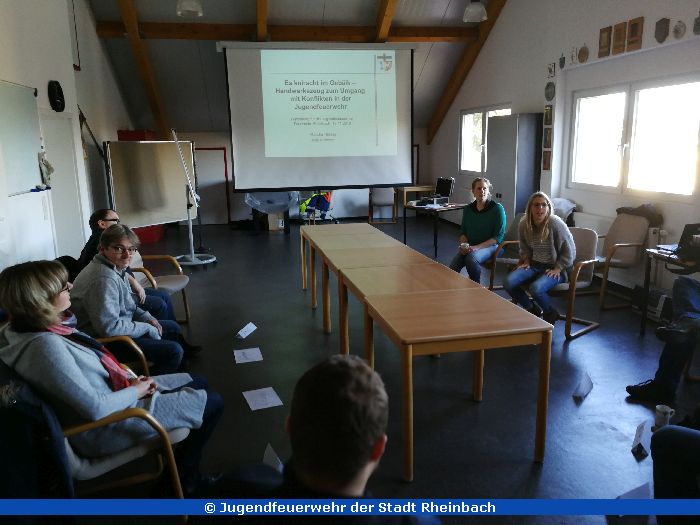 Samstagmorgen, 10 Uhr in der Feuerwache Rheinbach: Ein gemütlicher Stuhlkreis , der aus den Jugendbetreuern der einzelnen Jugendfeuerwehrgruppen im Stadtgebiet besteht und zwei jungen Damen, nämlich Mascha und Julia vom Jugendamt Rheinbach. Es steht die jährliche Fortbildung für Jugendgruppenleiter an, bei der immer ganz unterschiedliche Themenschwerpunkte behandelt werden. In diesem Jahr lag das Augenmerk auf Konflikten in der Jugendfeuerwehr und welche Lösungsansätze es gibt, bzw. wie man Konflikte erkennt und mit ihnen umgeht.
