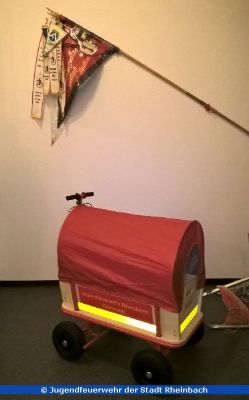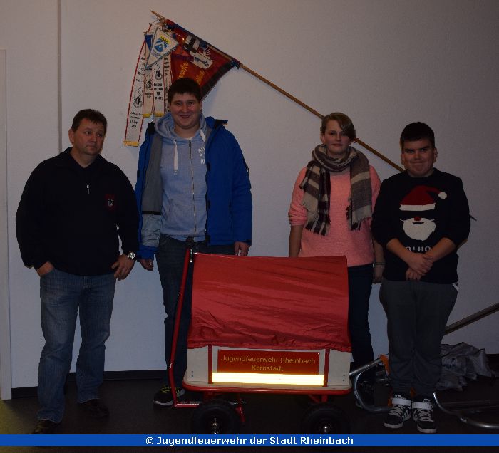 Als Dankeschön übergab er zusammen mit Löschgruppenführer Thomas Gundlach und Katarina Knoch das diesjährige Weihnachtsgeschenk für die Jugendfeuerwehr: Einen eigenen Bollerwagen! Mit Bremse, Plane und Beschriftung à la Feuerwehrfahrzeug. Der Wagen wird in Zukunft bei Veranstaltungen der Jugendfeuerwehr mitgenommen. Hier können neben Getränken auch Jacken oder Rucksäcke transportiert werden. So geht nichts mehr verloren! Der Jugendgruppenvorstand um Laura Fischer nahm den "Gerätewagen Logistik 0,5" strahlend entgegen.